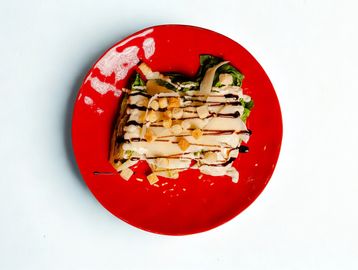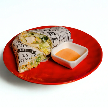 Piadina with grilled chicken breast, gem lettuce, and Caesar dressing.