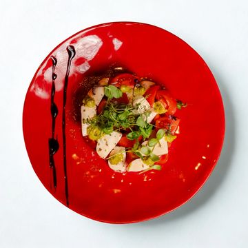 A plate with Cherry mozzarella, Campari tomatoes, pistachio pesto & Oregano.