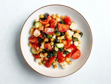 Campari tomatoes, cucumber, olives, feta, capers, croutons, chives, and oregano.