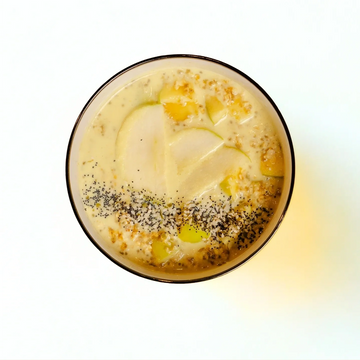 Oats with milk, chia seeds, turmeric, honey, apple, and cinnamon.