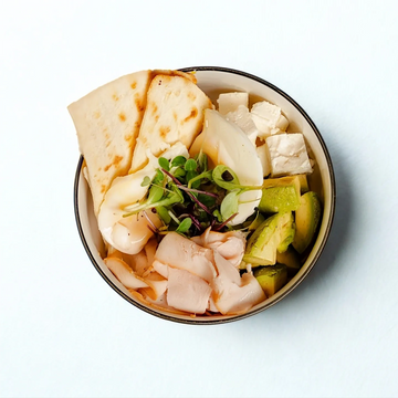 Our Breakfast Bowl with Eggs, Avocado, smoked turkey sakura mix, Greek Feta, Piadina bread.