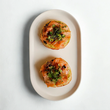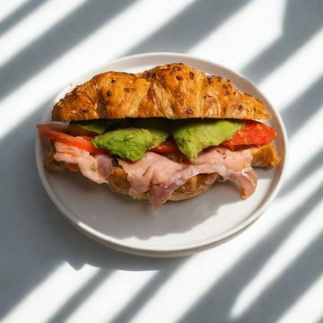 Buttery croissant layered with smoked salmon, creamy avocado, and fresh tomato for a rich and refreshing bite.