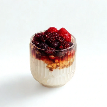 Greek yogurt layered with granola, chocolate chips, mixed berries — optional maple syrup.