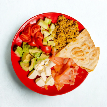 Seasoned Buckwheat with turmeric, Cherry Mozzarella, Cucumber, Avocado, Cherry Tomatoes, Salmon and Piadina Bread