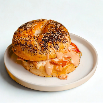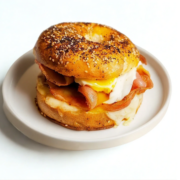 Toasted all-seed bagel with eggs, crispy bacon, mozzarella.