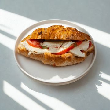 A golden, flaky croissant filled with creamy mozzarella and juicy tomatoes for a timeless savory pairing.